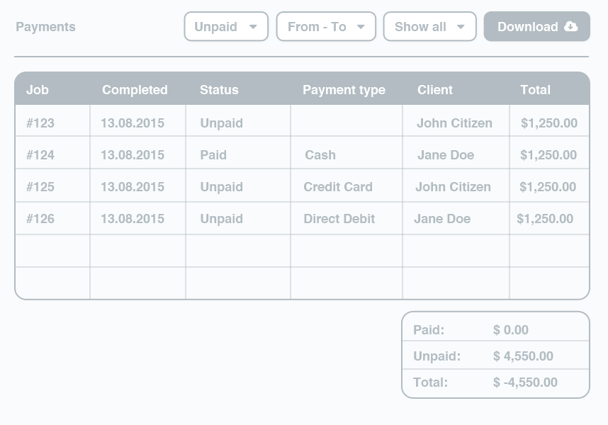 Payments are monitored by the system you can see at the touch of a button what work is on the calendar and the monetary value of that work. You are able to search the system allowing you to know what is owed and the total of all the work you have quoted carried out or indeed what work is pending. You are able to mark on the system the type of payment if you wish to track how people are paying you.